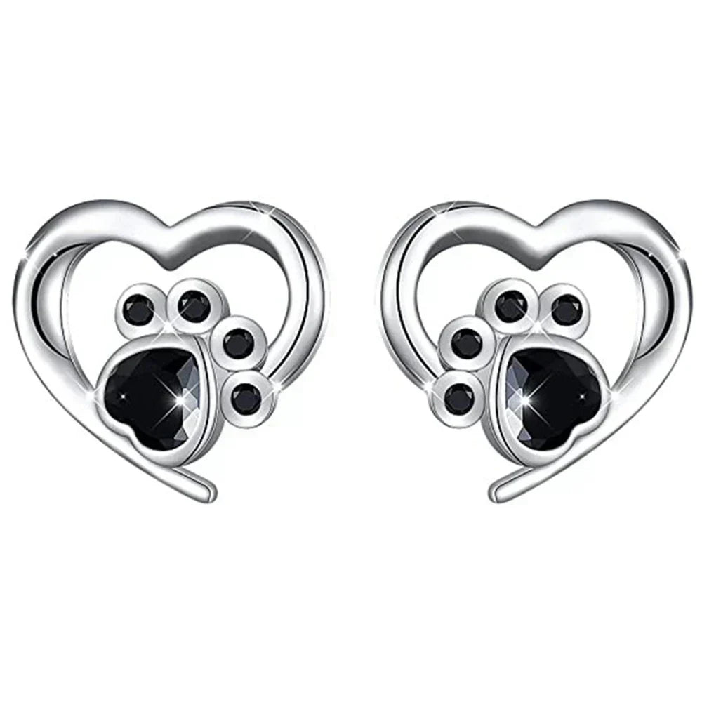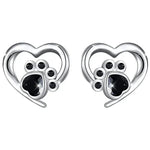 Heart-Shaped Earrings with Paw Print – Silver Earrings with Black Crystal