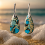 Orelia Earrings are inspired by the stunning beauty of Big Sur, where rugged cliffs meet the deep blue sea. Turquoise stones perfectly match the golden beige tones of the sea foam coastline, creating a composition that evokes jungle landscapes and pure freedom.